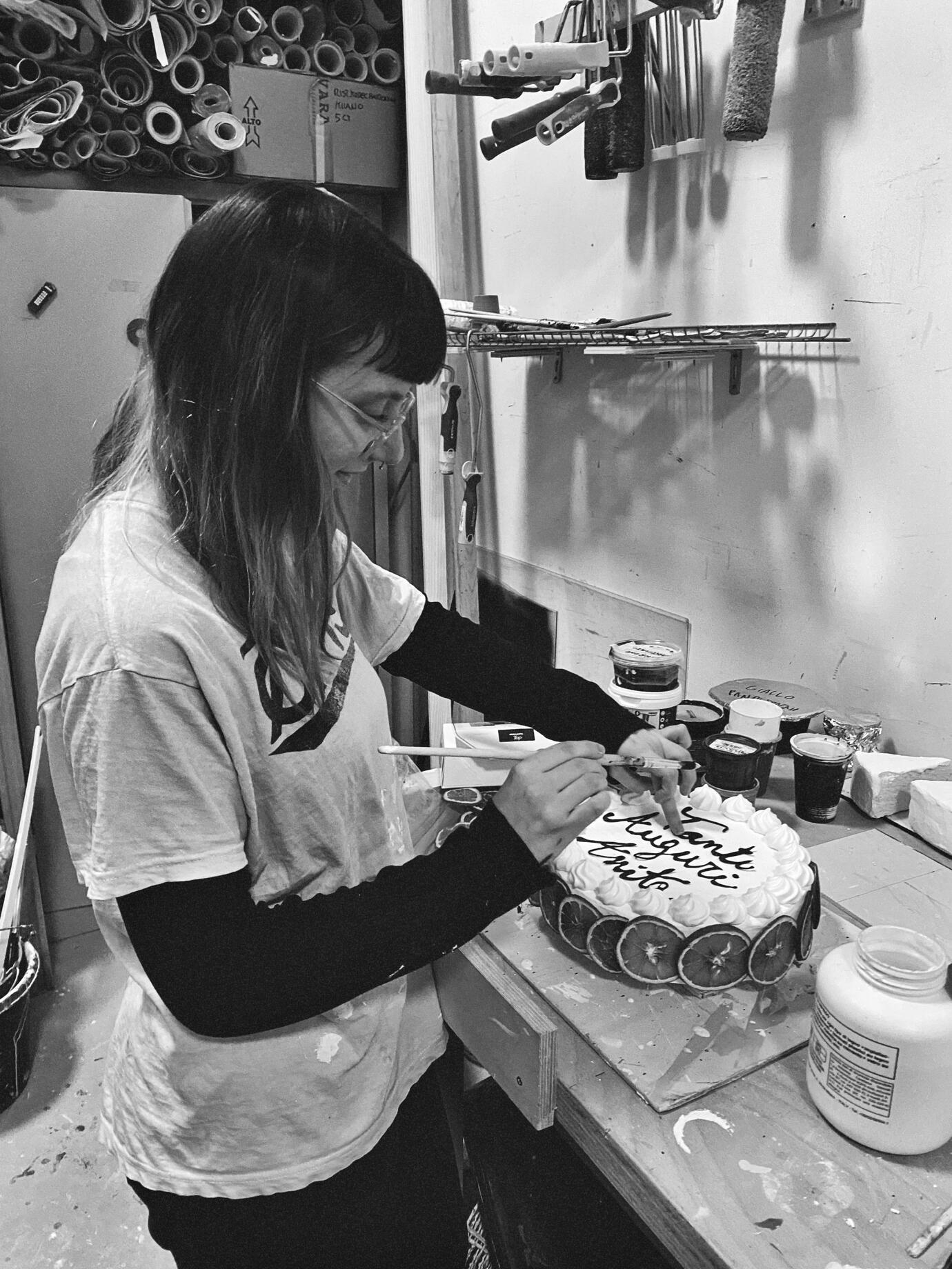 Realizzazione di una torta scenica in polistirolo, rifinita con gesso, pittura e dettagli decorativi realistici (meringhe, fette di arancia essiccata, scritte finte in cioccolato), in doppia versione: intera e a fette.Prodotto da Civica Scuola di Cinema Luchino Visconti